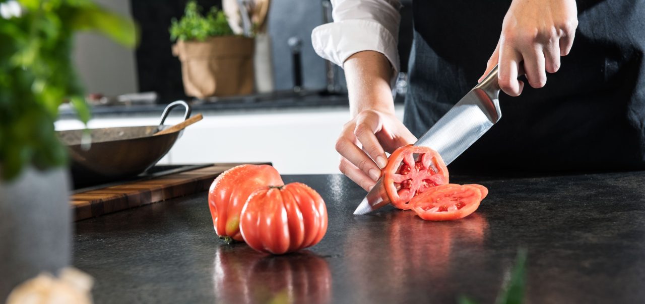 Man kann auf der Arbeitsplatte mit leichtem Druck schneiden (Achtung: nicht mit Keramikmessern). Um Metallabriebe auf der Arbeitsplatte und Beschädigungen an den Messern zu vermeiden, empfehlen wir jedoch, ein Schneidebrett zu verwenden.