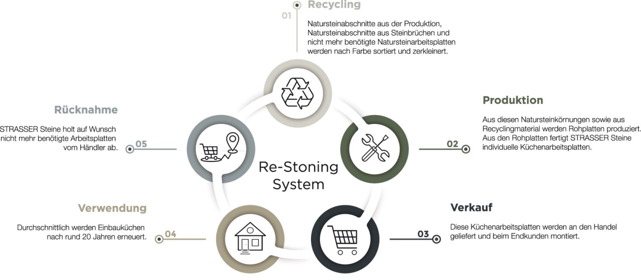 ALPINOVA, die erste RE-STONING Arbeitsplatte und Kücheninsel der Welt. Geformt aus 90 % recyceltem Naturstein und/oder Feldspat ist diese Weltneuheit eine Revolution in der Geschichte der Arbeitsplatten und Kücheninseln.