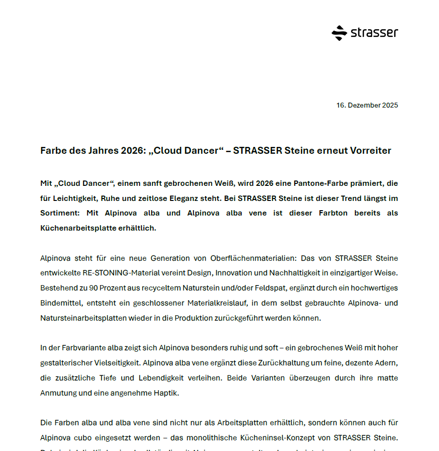Farbe des Jahres 2026: „Cloud Dancer“ – STRASSER Steine erneut Vorreiter