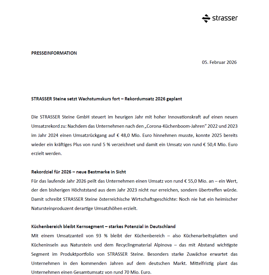 STRASSER Steine setzt Wachstumskurs fort – Rekordumsatz 2026 geplant